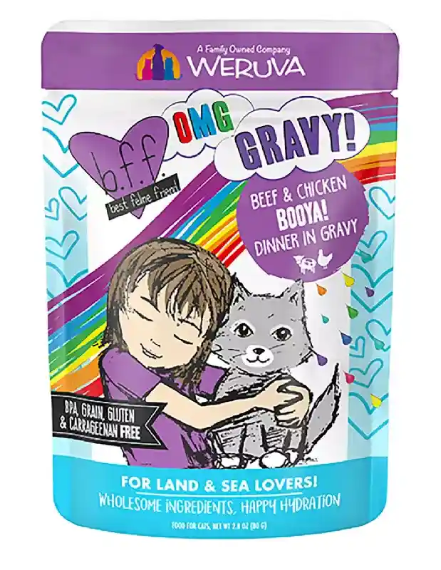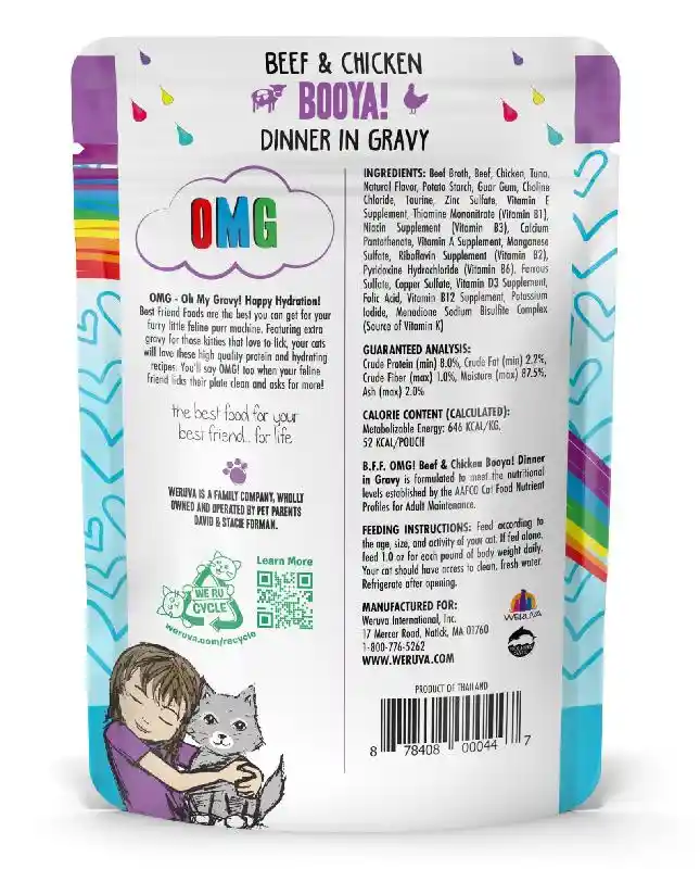 BFF OMG Booya! Beef & Chicken Wet Cat Food Pouch 2.8oz is packed with minced beef and chicken within a sea of delectable gravy that is full of moisture and flavor. You'll exclaim "booya!" when you see your cat eat up this meal.