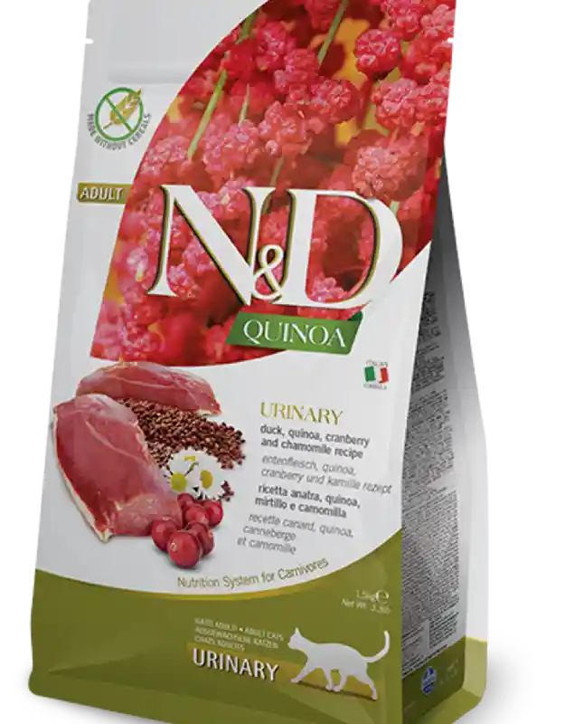 N&D Quinoa URINARY - Duck, quinoa, cranberry and chamomile recipe for adult cats is formulated to meet the nutritional levels established by the AAFCO Cat Food Nutrient Profiles for maintenance.