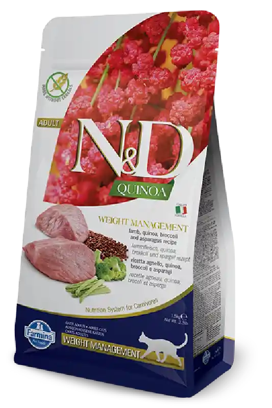 N&D Quinoa WEIGHT MANAGEMENT - Lamb, quinoa, broccoli and asparagus recipe for adult cats is formulated to meet the nutritional levels established by the AAFCO Cat Food Nutrient Profiles for maintenance.