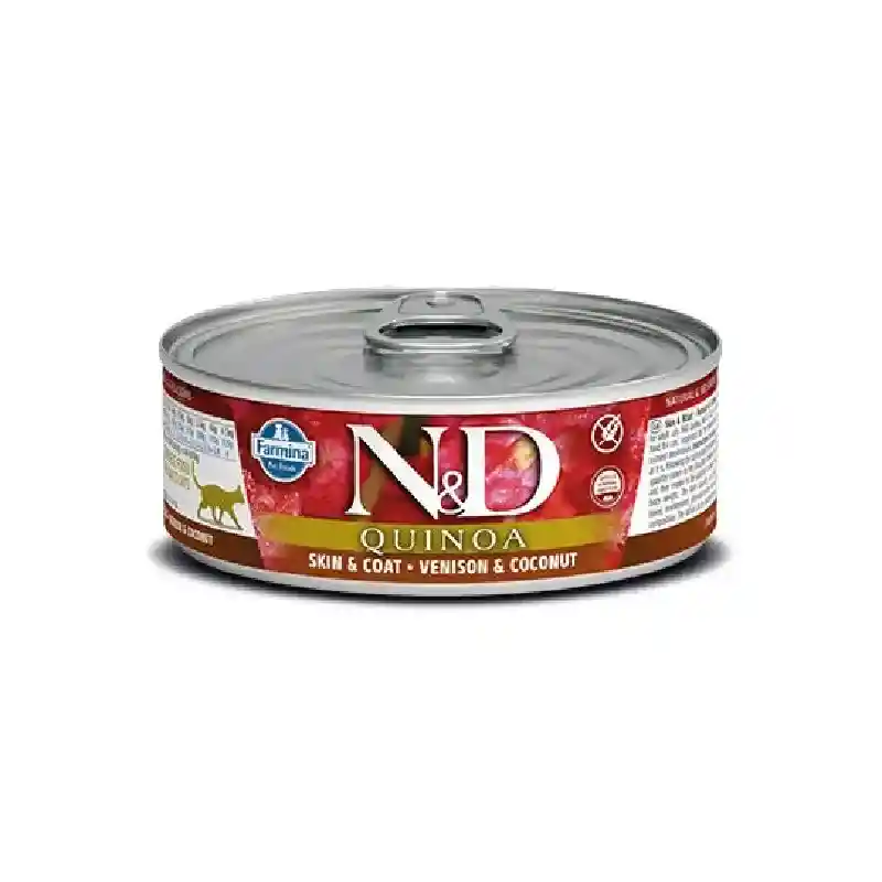 Farmina N&D Quinoa Functional Feline Wet Food uses up to 94% fresh venison with coconut, herring oil and quinoa, all rich in essential vitamins, minerals and antioxidants such as zinc, copper, Vitamin B, Omega-3 fatty acids, magnesium and more. This recipe helps support the immune system and promotes a healthy skin and coat.