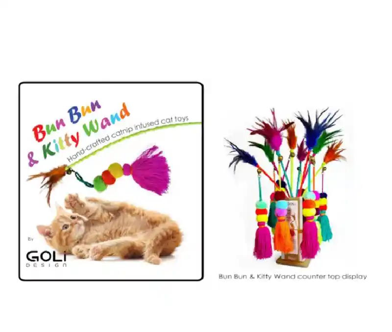 These Goli Design cat toys made up of a wand toy and Bun Bun (pom pom and tassel attachment). 27" long, hand woven with nylon yarns onto a plastic rod with feathers and a bell.