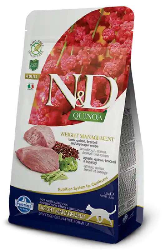 OBESITY? WEIGHT GAIN? N&D Quinoa Weight Management Lamb Feline is a complete and balanced diet with 96% of the protein from animal source formulated to meet the nutritional levels for maintenance. A special functional L.I.D. formula designed to help in restoring cats' ideal body weight and with maintaining it in cats with an overweight tendency. Made with Non-GMO and human-grade fresh (never frozen) ingredients like free-range grass-fed lamb, free-range eggs, sustainably sourced wild-caught herring, organic quinoa, broccoli and asparagus. Low glycemic index, low-fat, high-fiber, grain-free and gluten-free recipe with no legumes, potato, soy, meals, by-products, hormones, antibiotics, or artificial preservatives. Made with natural antioxidants, prebiotics and integrated additional taurine. All formulations are scientifically-proven and clinically-tested thru certified cruelty-free research. Guaranteed over 90% digestibility. THE ONLY KIBBLE FILLED WITH COLD INJECTED LIFE ESSENTIALS (dehydrated fruits and vegetables, botanicals, vitamins, and minerals are vacuum-infused cold-pressed into the kibble after cooking). Nitrogen filled bags to prevent the food from oxidation. All packaging is recyclable and BPA-Free.