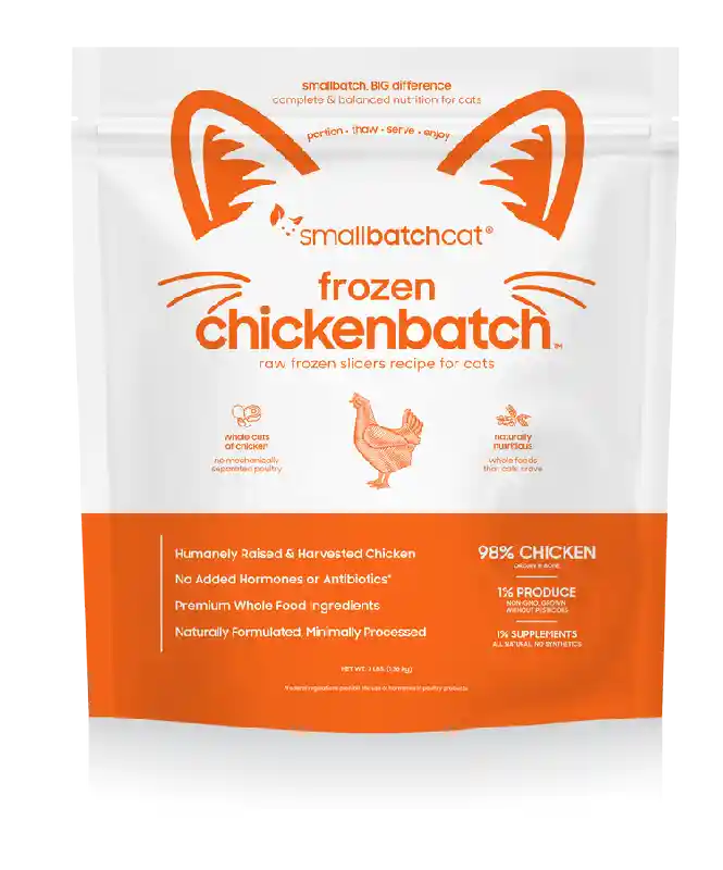98% humanely raised and harvested chicken, 1% organic produce, 1% natural supplements. Complete and Balanced – Smallbatch Cat Chicken Recipe Sliders is formulated to meet the nutritional levels established by the AAFCO Cat Food Nutrient Profiles for all life stages.