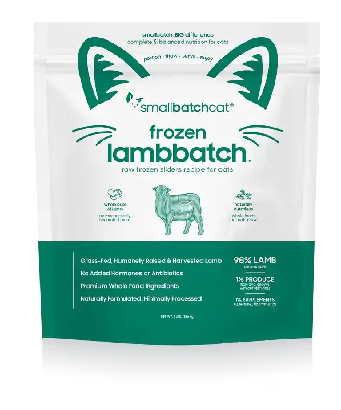 Single-source protein, complete raw diets for cats featuring 98% meat, organ and bone. Unlike other brands, smallbatch uses exclusively humanely raised, whole cuts of meat, non-GMO produce and whole food supplements for naturally derived nutrition. Portioned in convenient 1oz sliders, meals are easy to thaw and serve. Confidently feed your carnivore a minimally processed, nutrient and moisture rich diet