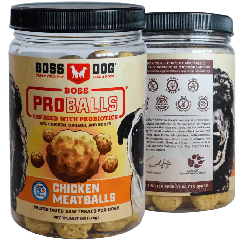 These delicious freeze dried raw meatballs are packed with probiotics at over 1 Billion Probiotics per ounce! Boss Proballs are delicious freeze dried raw meatball treats, a reward, a training tool, a topper or a pill pocket for dogs and cats!