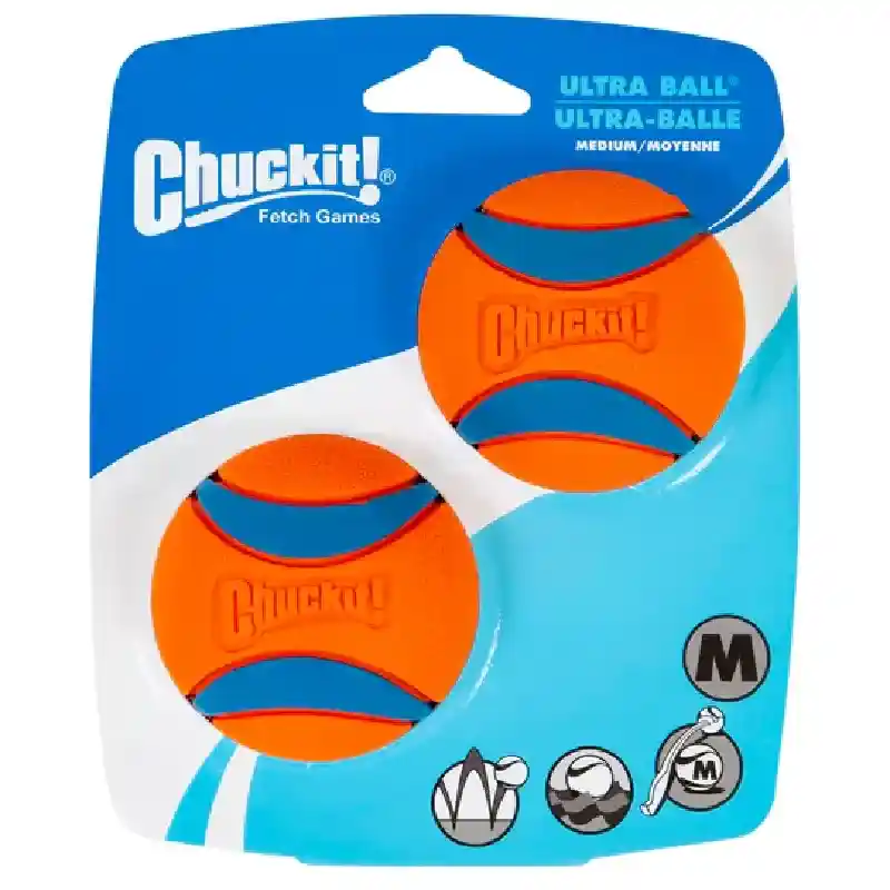 Super High Bounce: Better than standard tennis balls, the Ultra Ball is made of durable rubber yielding an ultra bouncy, exciting fetch experience on land or on water thanks to lightweight, bouyant design. Compatible with size Medium Chuckit Launchers. Tough and Durable: This rugged dog fetch toy has a textured surface and a thick rubber core that can stand up to rough play yet is soft on dog's mouths. Not intended as a pure chew toy, always supervise your dog when playing with this toy. Sizing matters: Size medium measures 2.5"" in diameter and is best suited for dogs weighing 20-60lbs. Dog balls should be small enough for your dog to carry, but large enough that the ball can't completely fit in their mouth. When in doubt, buy a size up. Make Fetch Happen: Chuckit Performance toys are designed with you and your dog in mind; Try our full range of indoor and outdoor interactive dog toys including tumblers, flyers, fetch toys, other balls for dogs and more