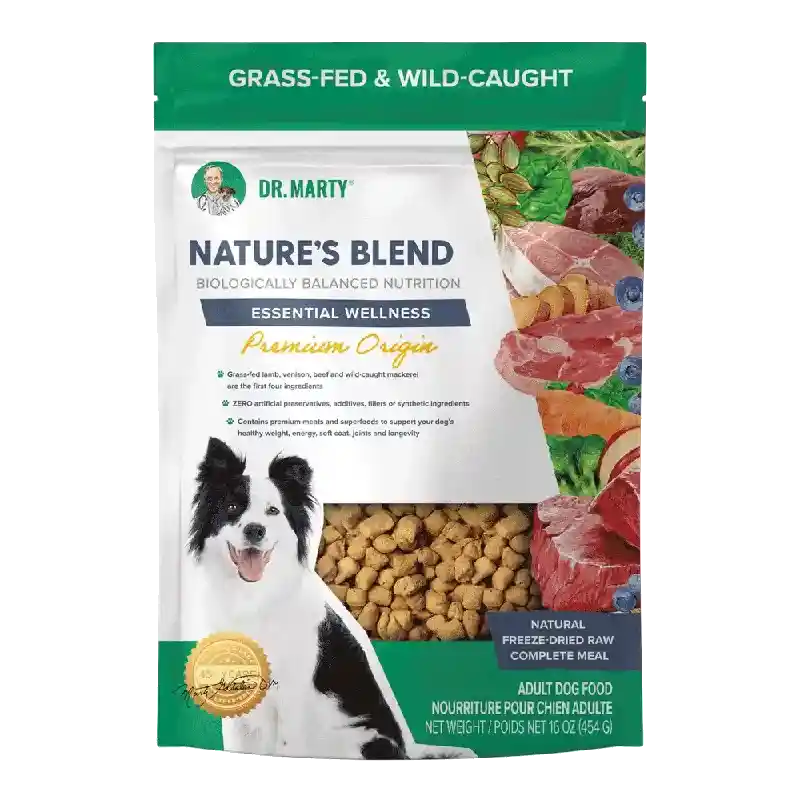 Dr. Marty Nature’s Blend – Essential Wellness Premium Origin is a premium freeze-dried raw food made with premium meats and superfoods to support your dog’s healthy weight, energy, soft coat, joints, and longevity… with ZERO artificial preservatives, or fillers.
