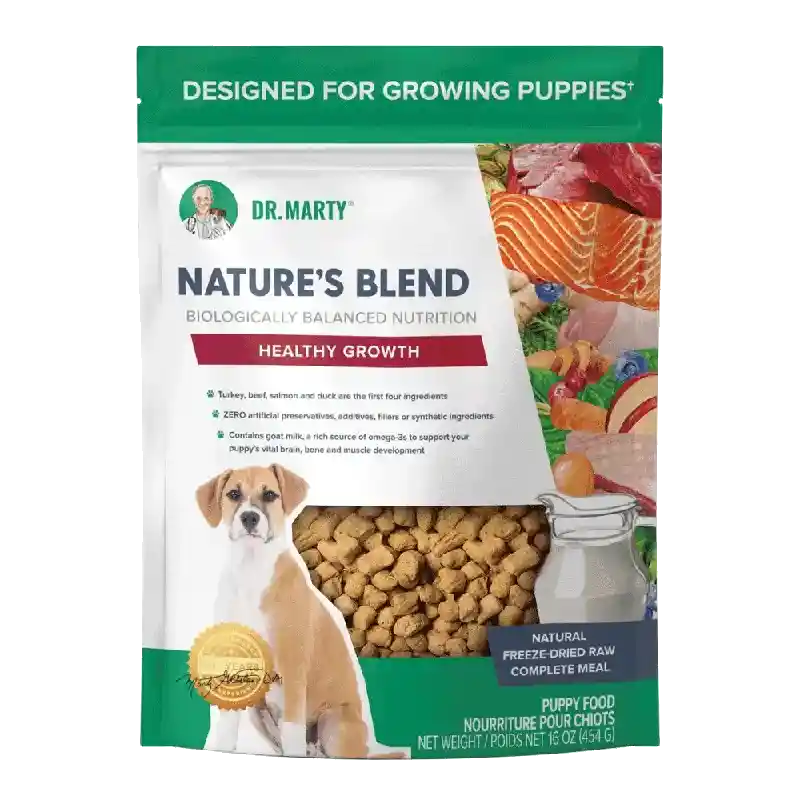 Dr. Marty Nature’s Blend – Healthy Growth is a premium freeze-dried raw food made specifically for growing puppies. It combines premium meat, vegetables, fruit, and key superfoods to support your dog’s strong muscles, sharp mind, healthy heart, active energy, easy digestion, and healthy immune system… with ZERO artificial preservatives, or fillers.