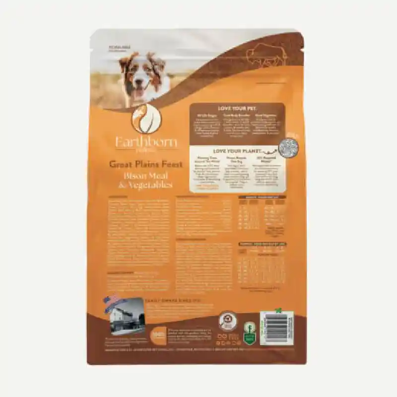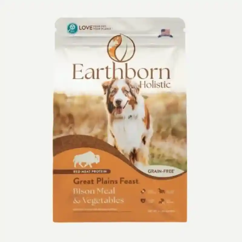 Earthborn Holistic Great Plains Feast is a high-quality dog food with bison and beef meal proteins and a mix of wholesome fruits and veggies. Enriched with Taurine for heart health and vitamins and minerals for optimal nutrition, this grain- and gluten-free recipe is a tasty option for your dog or puppy.