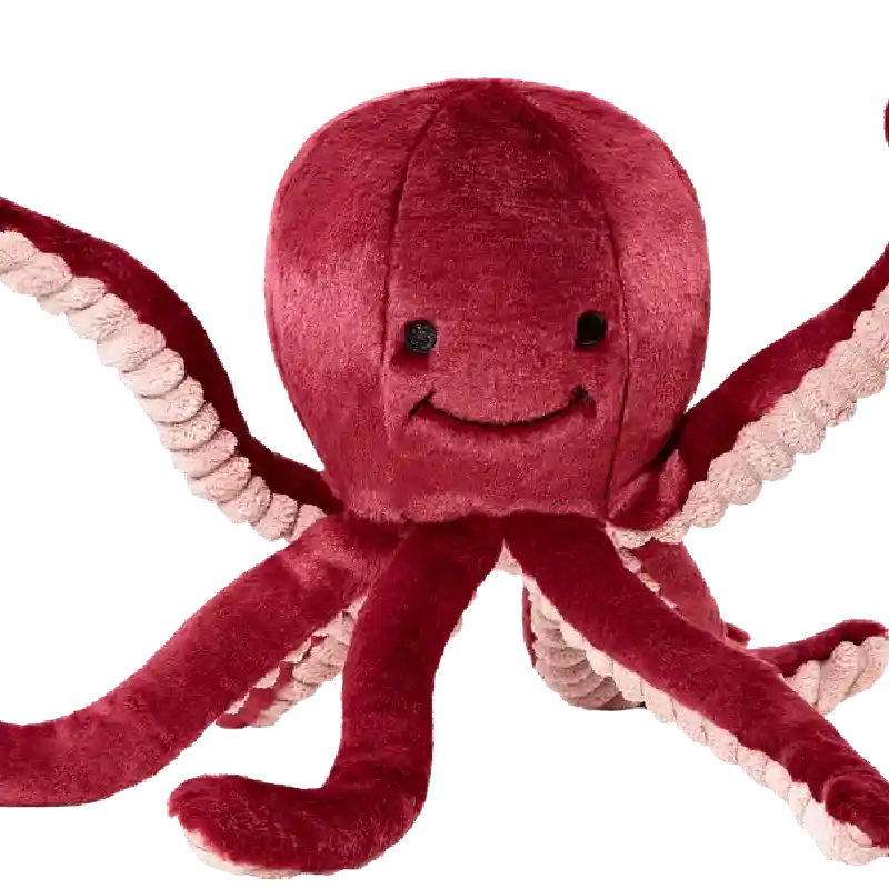 Olympia Octopus is a MEDIUM toy measuring 11" in height. Clever, creative play is the name of the game with Olympia Octopus. Her unique shape and eight legs open doors to all kinds of solo and group activities. She gives great hugs, too!