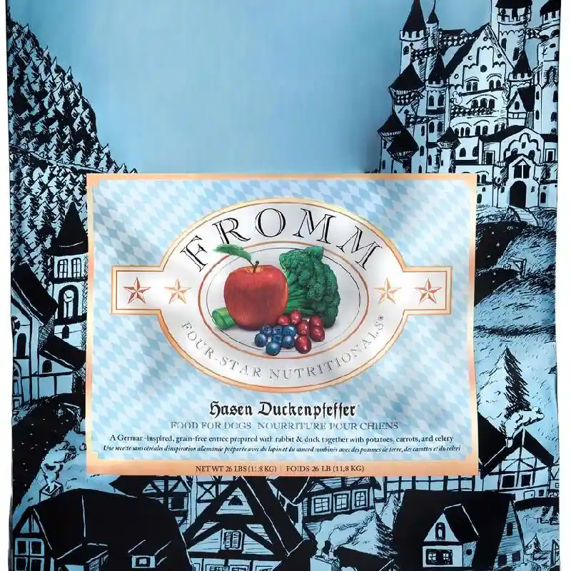 Fromm Four-Star Hasen Duckenpfeffer® Food for Dogs is a savory, grain-free recipe of rabbit and duck combined with hearty potatoes, carrots, and celery. This artisan blend is prepared in small batches, ensuring consistency, quality, and superior taste in each and every bowl. Hasen Duckenpfeffer® provides complete and balanced nutrition for dogs of all ages and can be fed in rotation with other Fromm Four-Star varieties.