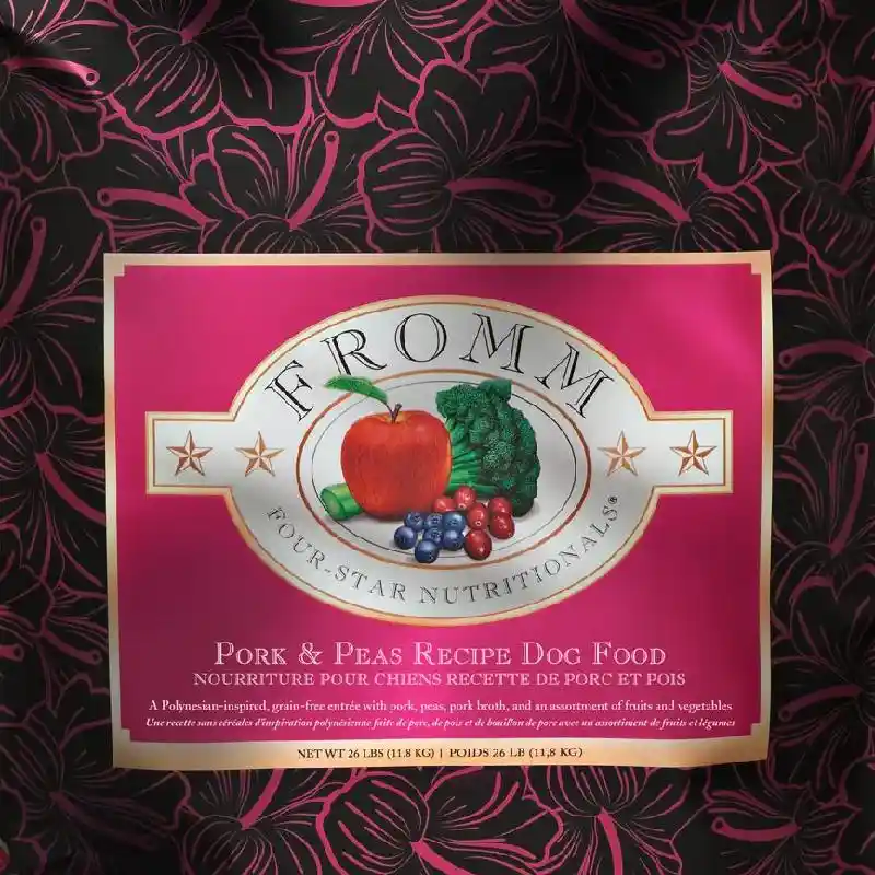 Fromm Four-Star Pork & Peas Recipe Dog Food is a grain-free Polynesian style entrée of pork and peas combined with an assortment of fresh, handpicked vegetables and fruits. This artisan recipe is prepared in small batches, ensuring consistency, quality, and superior taste in each and every bowl. Pork & Peas Recipe provides complete and balanced nutrition for dogs of all ages and, for variety, can be alternated with other Fromm Four-Star recipes.