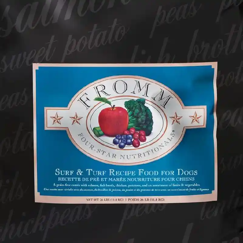 Fromm Four-Star Surf & Turf Recipe Food for Dogs is a savory grain-free blend of salmon, fish broth, chicken, potatoes, and an assortment of fruits and vegetables. This distinctive blend is specially prepared to ensure consistency, quality, and superior taste in each and every bowl. Surf & Turf Recipe dog food provides complete and balanced nutrition for dogs of all ages and can be alternated with other Fromm Four-Star recipes.