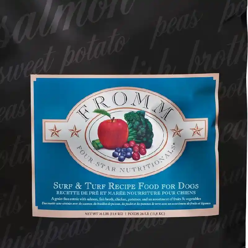 Fromm Four-Star Surf & Turf Recipe Food for Dogs is a savory grain-free blend of salmon, fish broth, chicken, potatoes, and an assortment of fruits and vegetables. This distinctive blend is specially prepared to ensure consistency, quality, and superior taste in each and every bowl. Surf & Turf Recipe dog food provides complete and balanced nutrition for dogs of all ages and can be alternated with other Fromm Four-Star recipes.