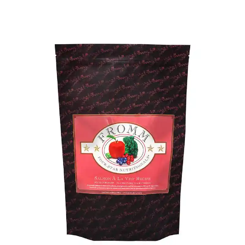 Fromm Four-Star Salmon À La Veg® is a delectable entrée of wild salmon combined with eggs, real Wisconsin cheese, and fresh handpicked vegetables and fruits. This artisan blend is prepared in small batches, ensuring consistency, quality, and superior taste in each and every bowl. Salmon À La Veg® provides complete and balanced nutrition for dogs of all ages and can be alternated with other Fromm Four-Star recipes.