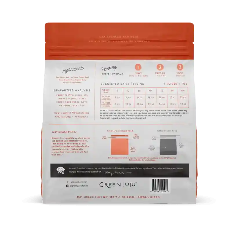 This complete and balanced, limited-ingredient raw diet starts with responsibly sourced, high-quality proteins, including nutrient-rich organ meat. Then we add a dark, leafy green and kelp. No grains, gluten or fillers. No synthetic vitamins or minerals. Only nourishing, natural ingredients for healthy, happy, energetic pups.