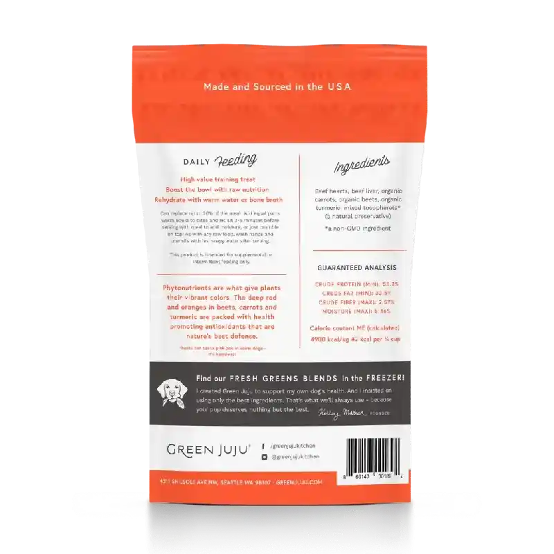 Made with grass-fed Pacific Northwest beef organs with organic beets, organic carrots, and organic turmeric.