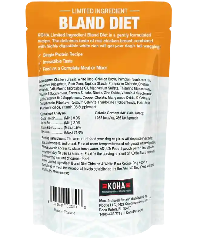 KOHA Limited Ingredient Bland Diet Chicken & White Rice Recipe Dog Food is formulated to meet the nutritional level established by the AAFCO Dog food Nutrient Profiles for Maintenance.
