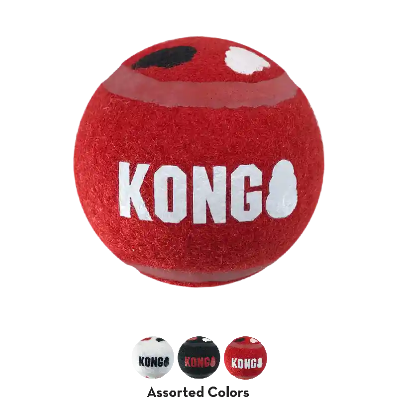 KONG Signature Ball 3-Pack delivers three different flavors of fetch, each with a unique texture for high-flying variety that keeps pups playing. These super-sturdy, ultra-bouncy balls offer long-lasting action, satisfying dogs’ chasing and retrieving instincts with tons of healthy exercise. Some squeak, some do not. KONG Signature Sport Ball felt is gentler on teeth and gums than regular tennis balls for safer play.