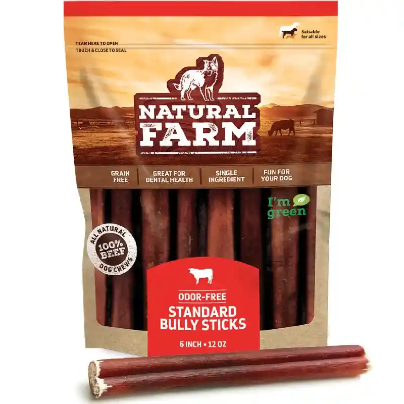 Meaty and long-lasting: Our 6 Inch Bully Sticks keep dogs mentally stimulated while treating them to a boost in high-quality protein. A positive outlet for your dog’s chewing instinct (a way to relieve stress and excess energy). Bully sticks are fully digestible and remove plaque as your dog chews. They are also a rich source of amino acids for better brain health, stronger muscles, and joint support. Great for a shiny coat, too. Best for medium chewers. Natural Farm Bully Sticks never contain preservatives or additives, and they’re made from 100% grass-fed beef.
