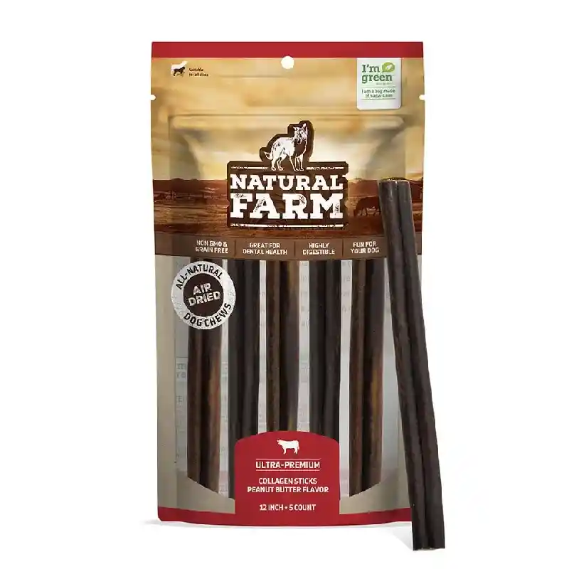 Who knew healthy could taste delicious? Natural Farm's Peanut Butter Flavor Collagen Sticks are long-lasting and made with highly digestible, all-natural beef skin and dipped in an unbelievably decadent peanut butter flavor. Dogs can indulge in the sweet and savory taste while receiving skin, coat, and joint support. Great for medium and hard chewers.