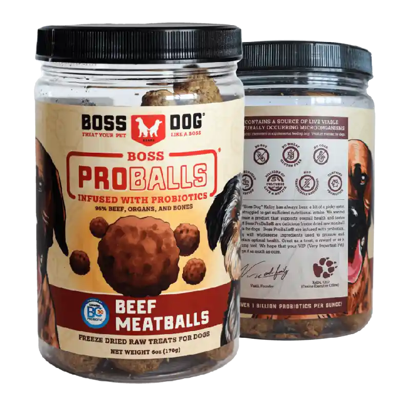 These delicious freeze dried raw meatballs are packed with probiotics at over 1 Billion Probiotics per ounce! Boss Proballs are delicious freeze dried raw meatball treats, a reward, a training tool, a topper or a pill pocket for dogs and cats!