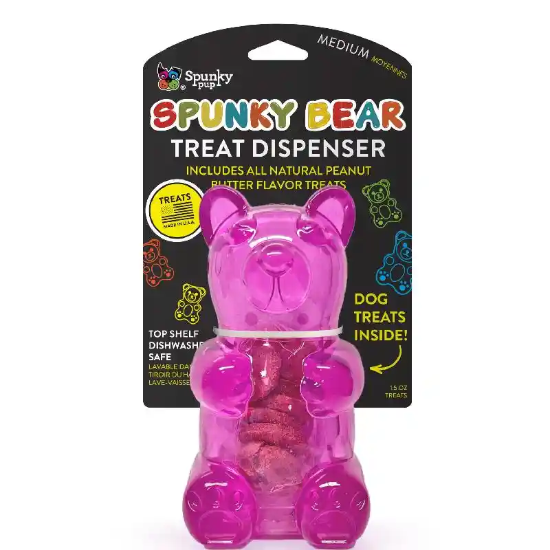 The Spunky Bear Treat Dispenser is Non Toxic, Dishwasher Safe and comes with all natural peanut butter treats from Spunky Pup!