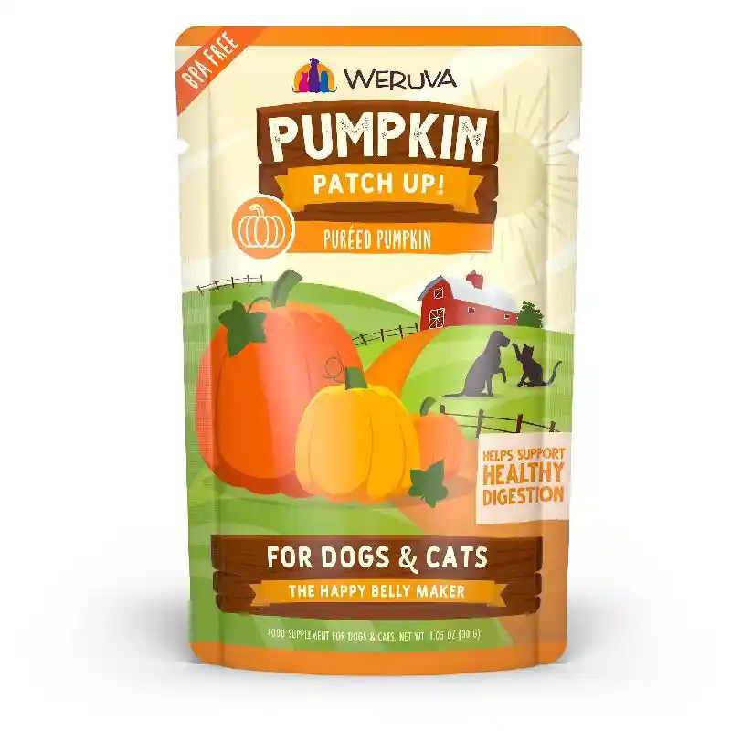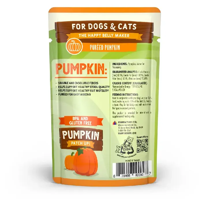 A healthy tummy is a happy tummy! Weruva's pumpkin supplement is a great source of healthy soluble and insoluble fibers to help support your cat's or dog's digestive system. We combine the healthy digestive benefits of pumpkin in an easy to serve pouch.