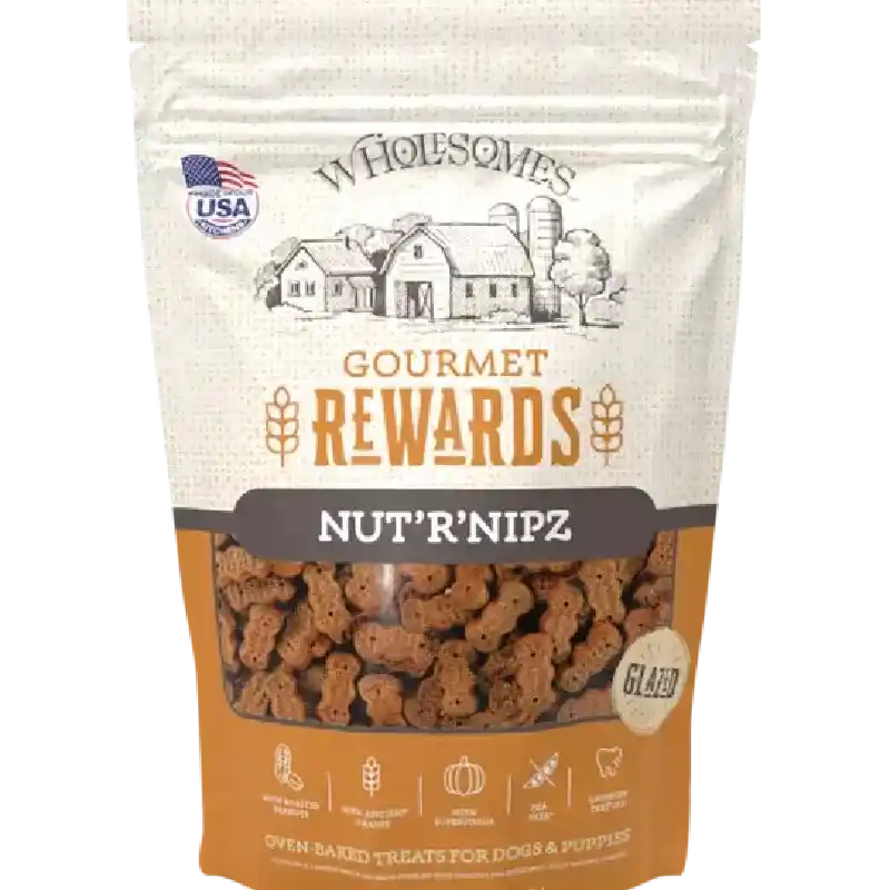 Gourmet Rewards Nut’R’Nipz are small in size, but mighty in taste. Your adult dog or puppy will love the roasted peanut flavor and crunchy texture, making them a perfect reward or training aid. Each dog biscuit treat is made with high quality chicken protein, ancient grains like oatmeal for heart health, and superfoods like pumpkin and sweet potato to help support a fit lifestyle for your dog. These pea-free crunchy treats are proudly made in family-owned kitchens located right here in the USA.