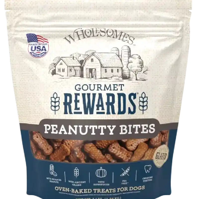 Gourmet Rewards Peanutty Bites are packed with roasted peanuts for a delicious bite time and time again. Proudly made in family-owned, USA kitchens, your dog will go nuts for these tasty treats! Their crunchy texture helps support a clean mouth and fresh breath. Each dog biscuit treat is made with high quality chicken protein, ancient grains like oatmeal for heart health, and superfoods like pumpkin and sweet potato to help support a fit lifestyle for your dog. Use these pea-free crunchy treats as a reward or training aid!