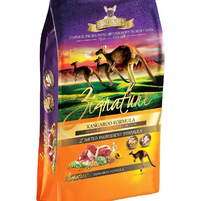Zignature Small Bites has smaller sized kibble for small breeds. Zignature Kangaroo Small Bites Formula features a novel, lean animal protein that is rich in nutrients and has twice the amount of Vitamin B12 than any other meat protein. It also has high Omega-3 content for good heart health. Kangaroo Formula is always grain-free to help reduce food sensitivity.